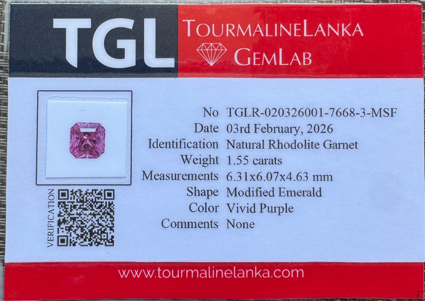 This beautiful natural rhodolite garnet displays a vivid purple color with rich saturation and lively brilliance. Cut in an elegant modified emerald shape, the gemstone reflects light beautifully, highlighting its vibrant color and refined sparkle.