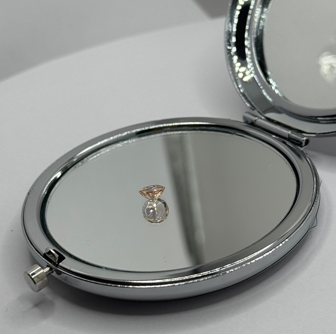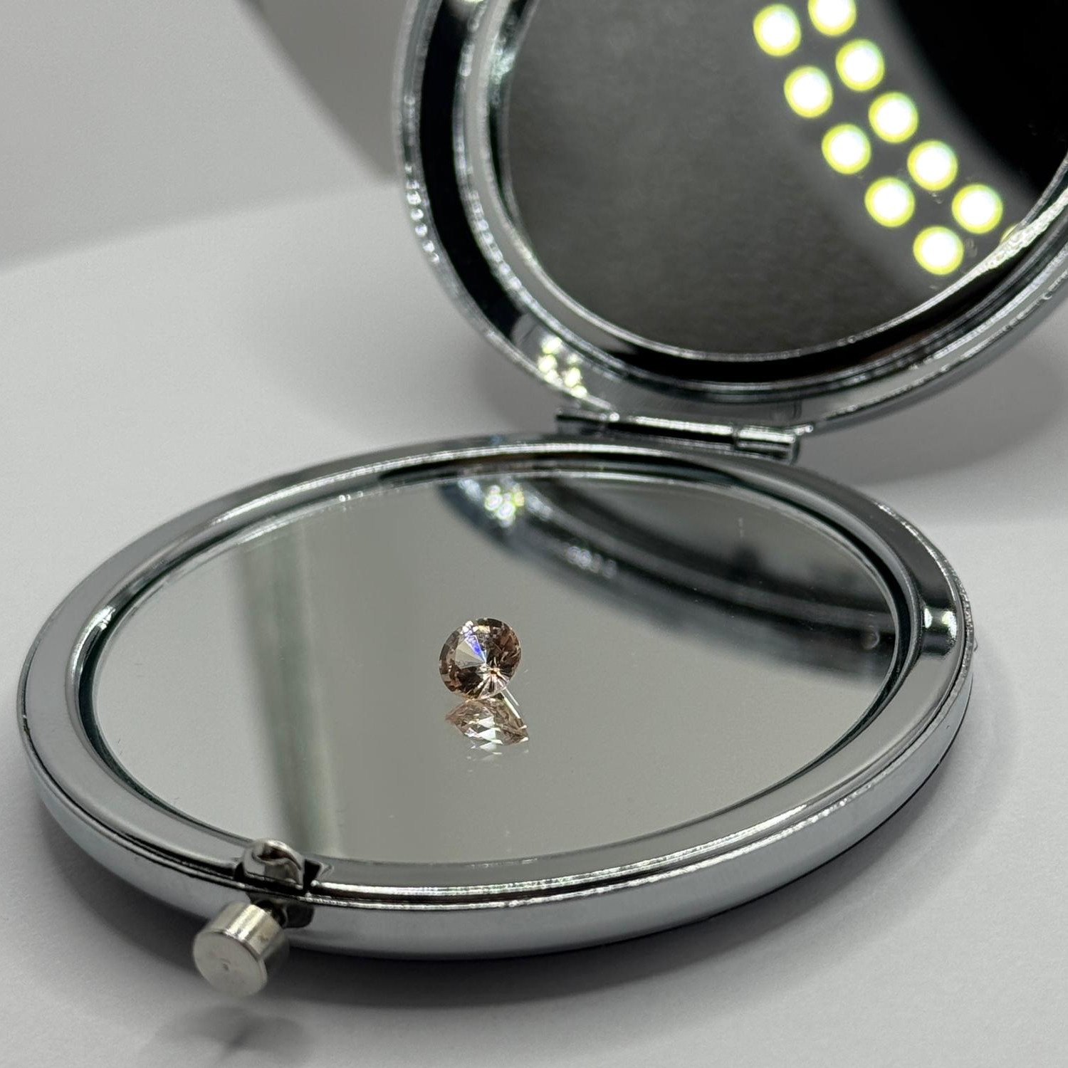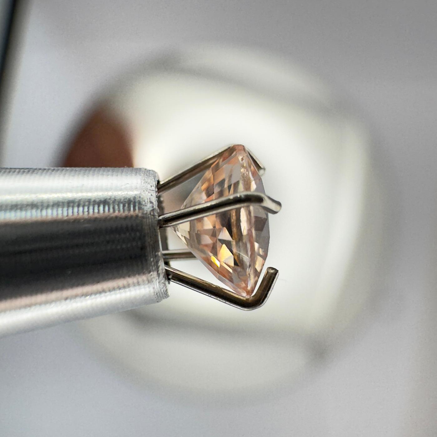 The round brilliant cut magnifies light return, allowing the stone to sparkle while maintaining its soft, romantic color balance.