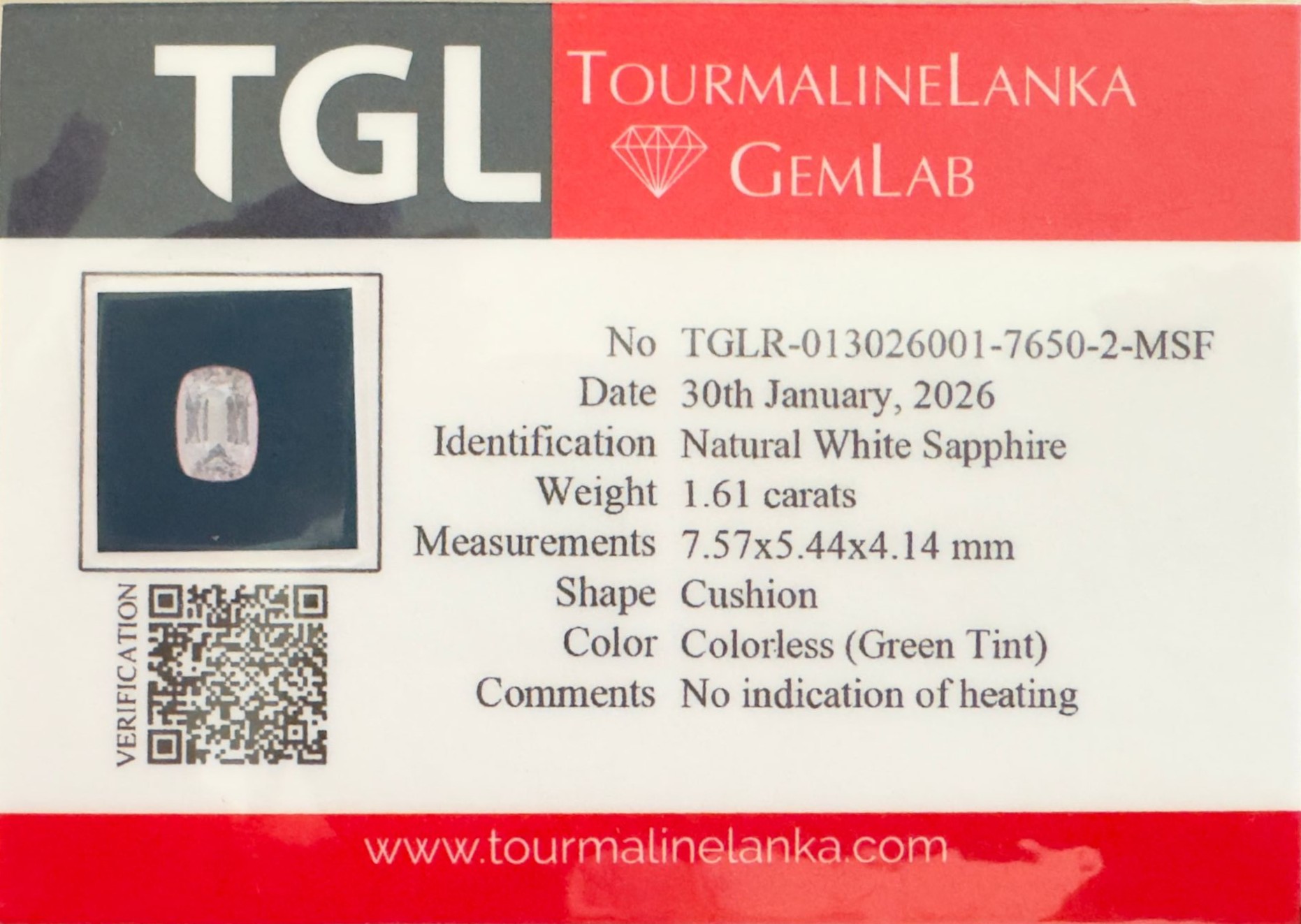 Unheated Natural Sri Lankan White Sapphire – 1.61ct Cushion Cut